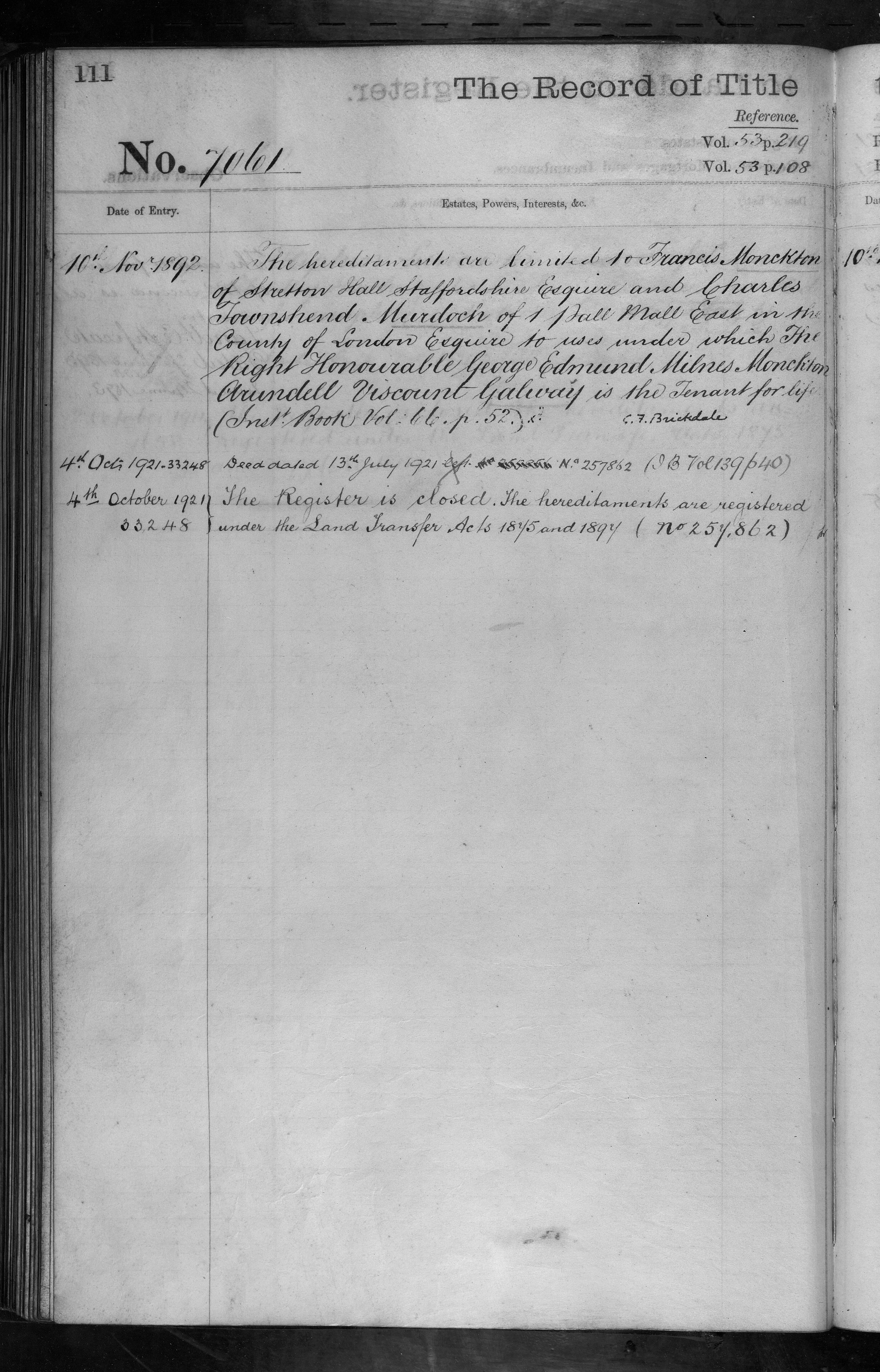 - Francis Monckton, Charles Townshend Murdoch, The Right Honourable George Edmund Milnes Monckton Arundell Viscount Galway