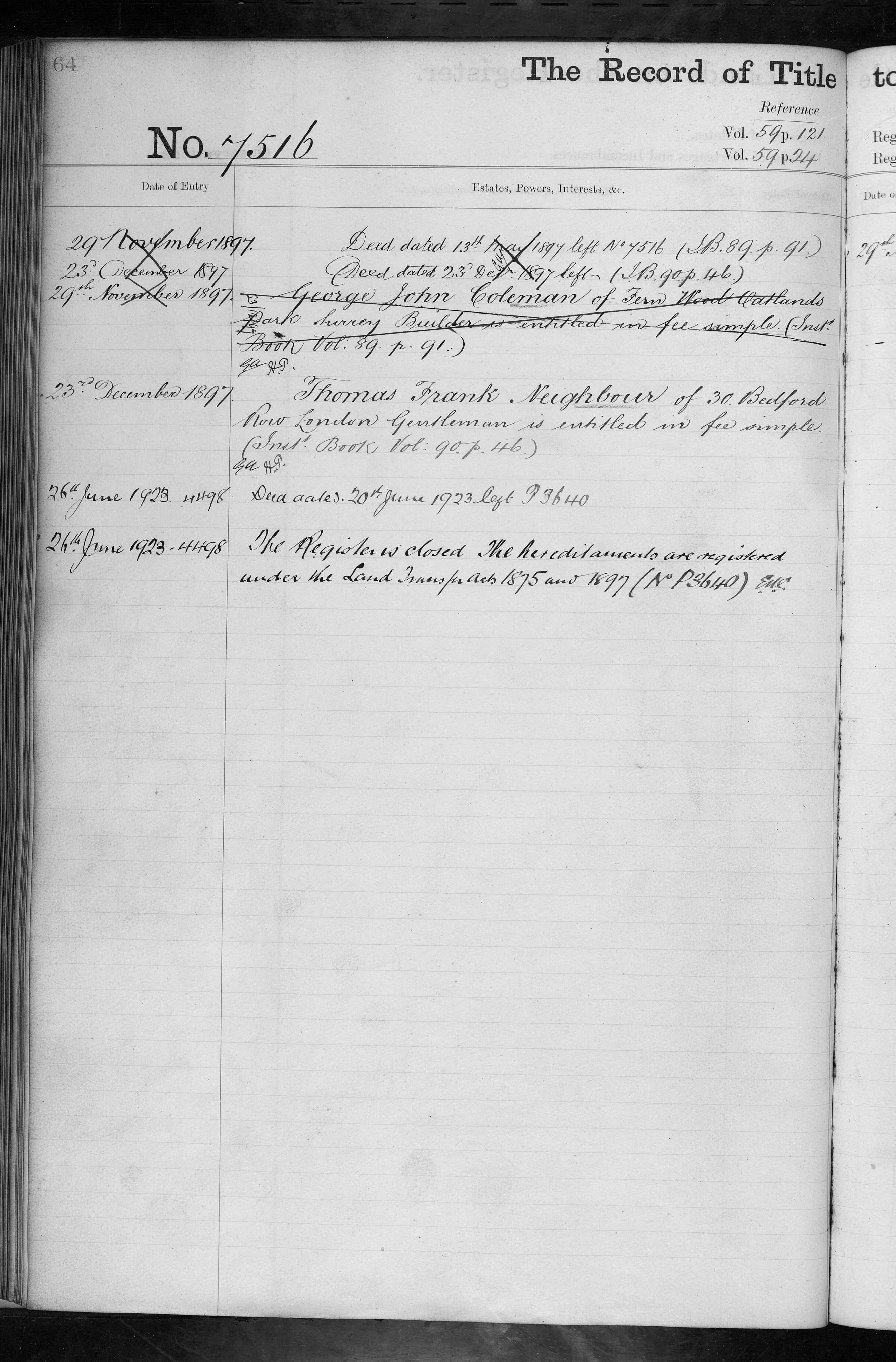 - George John Coleman, Thomas Frank Neighbour
